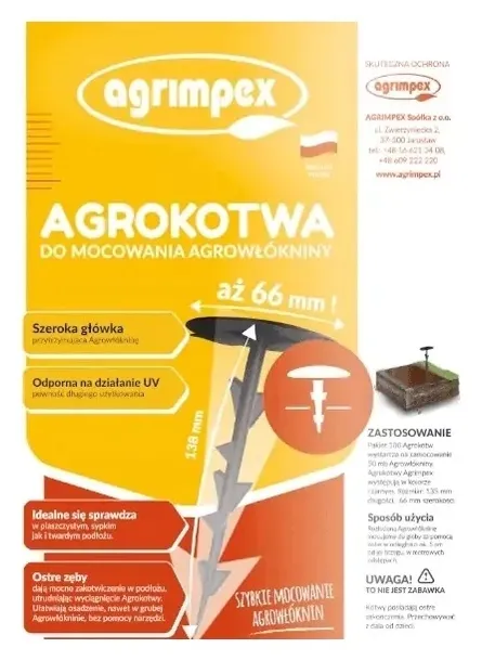 Dzięki wytrzymałej konstrukcji, agrokotwa Agrimpex świetnie sprawdza się w trudnych warunkach pogodowych, takich jak silne wiatry czy intensywne opady, które mogłyby przesunąć agrowłókninę. Produkt wykonano z trwałych materiałów, co gwarantuje jego długowieczność, odporność na uszkodzenia i wielokrotne użycie. Dzięki odpowiednio wyprofilowanej konstrukcji agrokotwa zapewnia maksymalną przyczepność do podłoża, minimalizując ryzyko przesuwania się agrowłókniny na lekkich i piaszczystych glebach.