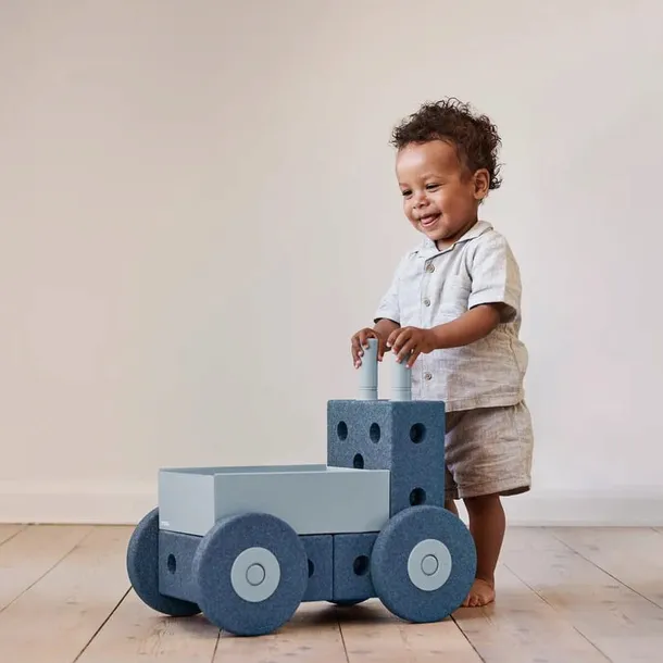Może pełnić funkcję pchacza, wózka, taczki, stołka lub elementu większej konstrukcji