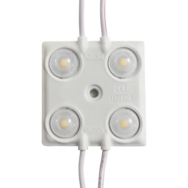 Moduł LED z czterema diodami o wysokim poziomie szczelności IP67 zapewniający bezawaryjną pracę w trudnych warunkach zewnętrznych np. przy oświetleniu reklam zewnętrznych. Moduły wyposażonę są w dwustronną taśmę klejącą ułatwiającą montaż. Przeznaczone są zarówno do użytku profesjonalnego:reklamy, banery, ekspozycje sklepowe, jak i domowego: meble, teraria itp. Produkt objęty jest dwuletnim okresem gwarancyjnym.