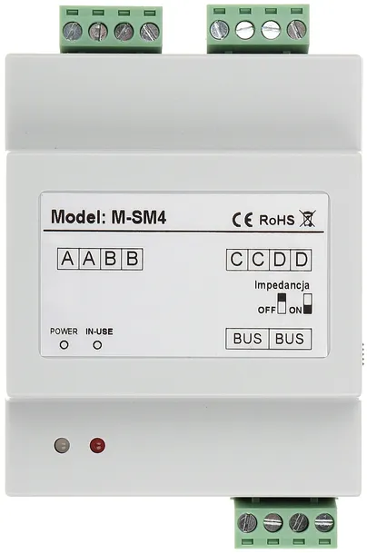 Moduł M-SM4 pozwala rozszerzyć funkcjonalność systemu wideodomofonowego VIDOS DUO. Urządzenie pozwala na przyłączenie do systemu max 4 paneli wewnętrznych lub bramofonów w przypadku, kiedy nie ma możliwości szeregowego połączenia urządzeń. Urządzenie jest szczególnie przydatne przy projektowaniu rozległych instalacji (np. w bloku mieszkalnym), gdy na każdym piętrze znajdują się 3-4 mieszkania. W takiej sytuacji, optymalnym rozwiązaniem jest umieszczenie jednego modułu M-SM4 na każdym piętrze i od tego modułu rozprowadzenie przewodów do poszczególnych paneli wewnętrznych w mieszkaniach. Ponadto produkt można wykorzystać do zwiększenia ilości bramofonów w systemie.