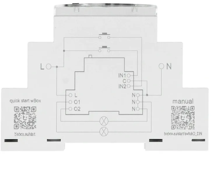 Podwójny przełącznik "ON/OFF" lub "WŁĄCZ NA CZAS" na szynę DIN BleBox switchBoxD DIN - specyfikacja: