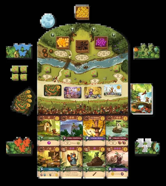 Zawartość opakowania: • instrukcja, • plansza, • 4 planszetki domów, • 4 kości surowców, • 8-ścienna kość do gry solo, • 12 pionków przyjaciół (3 motylki, 3 liski, 3 jaszczurki i 3 myszki), • 54 karty talii głównej (w tym 4 karty promocyjne), • 4 karty Kapitanów, • 4 karty Fortów, • karta gry solo, • 6 kart promocyjnych do podstawowej wersji gry „Everdell”, • jagody, • gałązki, • bryłki żywicy, • 16 żetonów parad, • żeton słońca, • żeton księżyca, • żetony punktów.