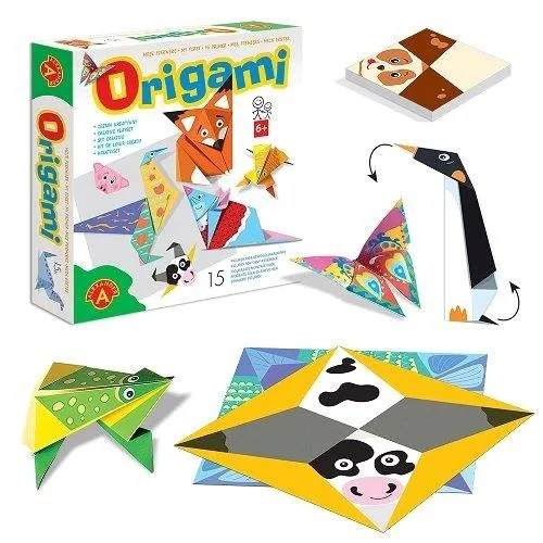 Doskonały wstęp dla każdego dziecka do klasycznej sztuki origami z jednej kartki papieru. W zestawie znajduje się 30 kolorowych arkuszy papieru do samodzielnego złożenia z zaznaczonymi liniami gięcia (po dwa arkusze na jeden model). Dzięki odpowiednio zadrukowanemu projektowi graficznemu, po złożeniu figurki wyglądają jak prawdziwy lisek, żabka, piesek, rekin czy dinozaur. Każdy model posiada obrazkową instrukcję montażu (bez konieczności czytania) jak również oznaczenie stopnia trudności.
