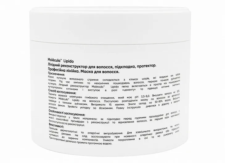 Ліпідна підкладка Molecula Lipido – це продукт, який допомагає відновити ліпідний шар волосся на молекулярному рівні. Використання цього реконструктора значно покращує стан волосся. Molécula Suporte de Lípido надає гладкість і еластичність, зміцнює волосся та запобігає втраті вологи, створюючи захисну плівку на їхній поверхні. Крім того, продукт надає волоссю блиск, забезпечує термозахист і запобігає ламкості та посіченим кінчикам.