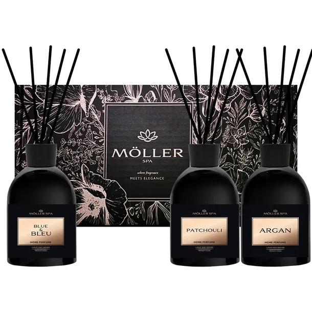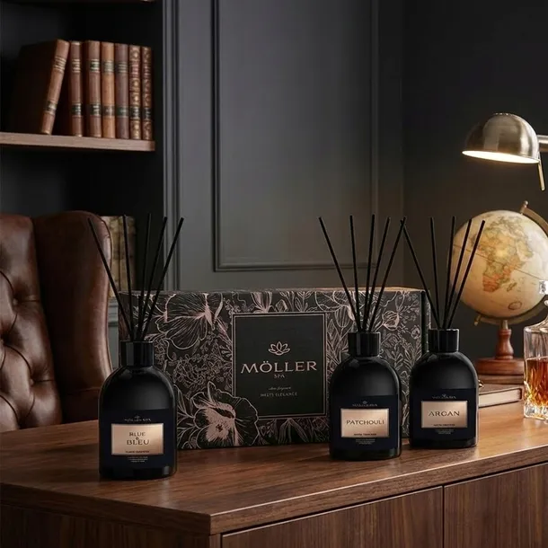 Zestaw Möller SPA to starannie skomponowany komplet dyfuzorów zapachowych, zamknięty w eleganckim ozdobnym pudełku.