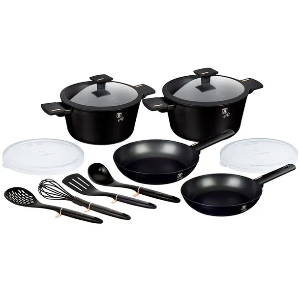Garnki, patelnie i akcesoria z serii MONACO TITAN COLLECTION firmy BERLINGER HAUS wykonane są z wysokiej klasy kutego aluminium pokrytego wewnątrz powłoką tytanową o bardzo wysokim współczynniku twardości. Powłoka zewnętrzna w kolorze czarnym matowym. Te atrakcyjne i modne naczynia wyposażone są standardowo w uchwyty typu SOFT TOUCH (silikon handle). Przystosowane do wszystkich rodzajów kuchenek: gazowa, elektryczna, ceramiczna, halogenowa, indukcyjna. System TURBO INDUCTION (bardzo szybko nagrzewają się) pozwala zaoszczędzić nawet 35% energii.