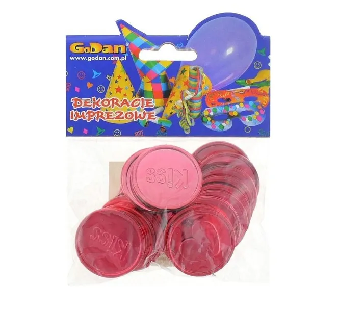 PLASTIKOWE MONETY WALENTYNKOWE Ilość sztuk w opakowaniu: 24 Z jednej strony moneta ma napis KISS a z drugiej serce. Monety są koloru czerwonego.