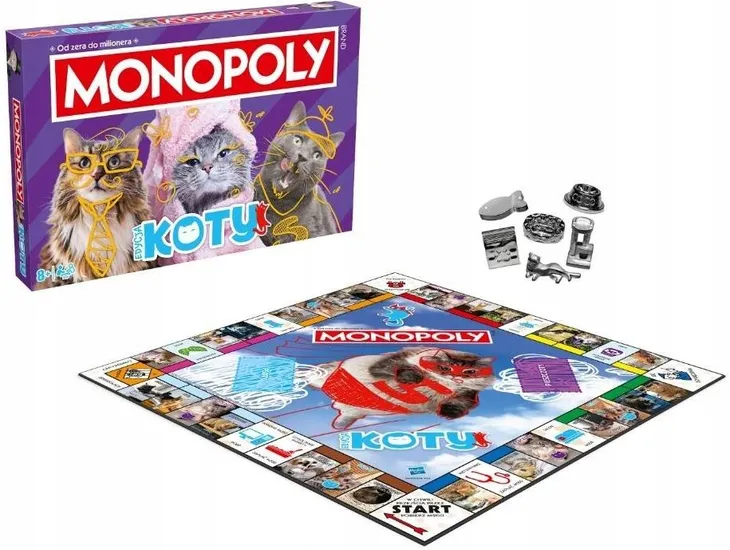 Monopoly Koty Zostań najlepszym opiekunem mruczących przyjaciół! Koty to niezwykle urocze, tajemnicze i pełne charakteru stworzenia, które potrafią w jednej chwili skraść nasze serca (i wygodnie rozgościć się w naszych domach). Dzięki edycji MONOPOLY Koty przeniesiesz się do świata futrzastych towarzyszy i ich ulubionych miejsc do zabawy i drzemek. Kupuj kocie domki i hotele, korzystaj z kart Psoty i Pieszczoty, a przede wszystkim baw się, zdobywając tytuł najlepszego kociego opiekuna! Zasady gry Każdy gracz wybiera pionek i otrzymuje banknoty w różnych nominałach. Rozgrywkę rozpoczyna osoba, która wyrzuci najwyższą liczbę oczek na kostce. Celem gry jest zgromadzenie jak największego majątku poprzez kupowanie pól na planszy. Uważaj! Gdy staniesz na czyjejś własności, musisz zapłacić. Wygrywa osoba, która zdobędzie dominację na planszy i doprowadzi przeciwników do bankructwa. Zawartość pudełka Plansza do gry,6 kolekcjonerskich pionków,28 kart Tytuł Własności,16 kart Psoty,16 kart Pieszczoty,Banknoty Monopoly,,32 domki,12 hoteli,2 kostki,Instrukcja. Specyfikacja Liczba graczy: 2-6,Wiek: 8+,Czas gry: 1-3 godziny,Język: polski