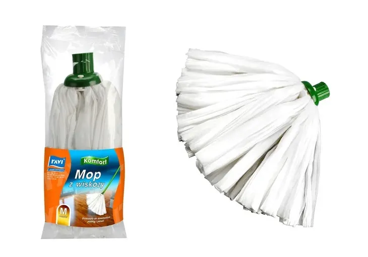 Mop Komfort z wiskozy roz. M Wyjątkowo skuteczny i wytrzymały mop paskowy z wiskozy, doskonale radzi sobie z zabrudzeniami nawet bez używania detergentów. Doskonały do mycia i polerowania różnego rodzaju powierzchni - szczególnie drewnianych podłóg i paneli.