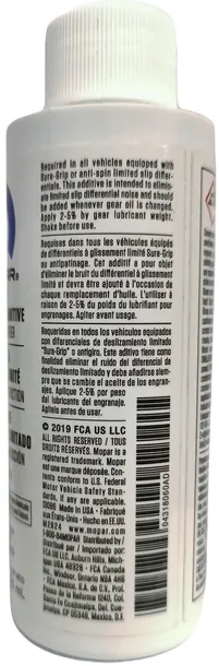Dodatek Mopar Limited Slip został opracowany dla Dodge, Ram, Chrysler, Jeep i innych mechanizmów różnicowych o ograniczonym poślizgu wymagających dodatku LS. Zwykle dodawany do olejów przekładniowych do mechanizmów różnicowych w celu poprawy funkcji ograniczonego poślizgu, zmniejszenia tarcia i wyeliminowania drgań w mechanizmach różnicowych o ograniczonym poślizgu trak-lock, sure-lock i power-lock.