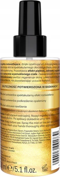 ✅Złota mgiełka rozświetlająca, dzięki opalizującym mikropigmentom, natychmiastowo dodaje skórze spektakularnego złocistego blasku w stylu „glamour” i podkreśla opaleniznę.