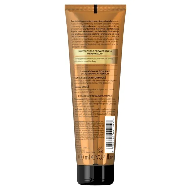 Rozświetlająco-koloryzujący krem do ciała zapewnia naturalny efekt skóry muśniętej słońcem. Natychmiastowy body make-up – zmywalny makijaż, który gwarantuje wyrównanie kolorytu, perfekcyjne krycie niedoskonałości i rozświetlenie. Lekka nawilżająca formuła, bogata w drobinki rozświetlające, nie brudzi ubrań oraz szybko się wchłania, nie pozostawiając smug i plam. Stanowi idealne dopełnienie pielęgnacji na co dzień oraz na specjalne okazje.SUN-KISSED SKIN FORMULA rozświetlające drobinki połączone ze złocistymi pigmentami tworzą idealny efekt wakacyjnej opalenizny.MASŁO SHEA natychmiastowo wygładza, odżywia oraz chroni skórę przed utrata wody.Stosowanie: Odpowiednią ilość rozprowadź równomiernie na skórze. Dla optymalnego efektu, przed zastosowaniem wykonaj dokładny peeling ciała. Umyj ręce bezpośrednio po aplikacji.