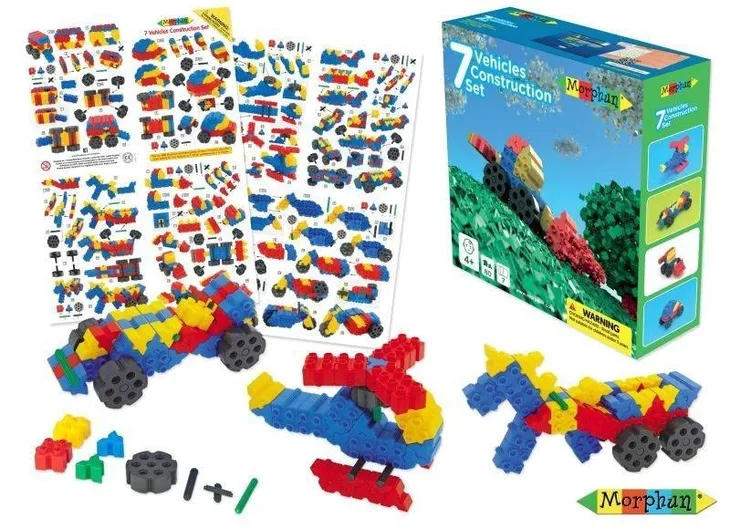 Morphun 7 Vehicles 80 elementów to klocki konstrukcyjne dla dzieci od 5 lat, które rozwijają wyobraźnię przestrzenną i motorykę małą. Zestaw pozwala zbudować 7 różnych pojazdów według kolorowych instrukcji.
