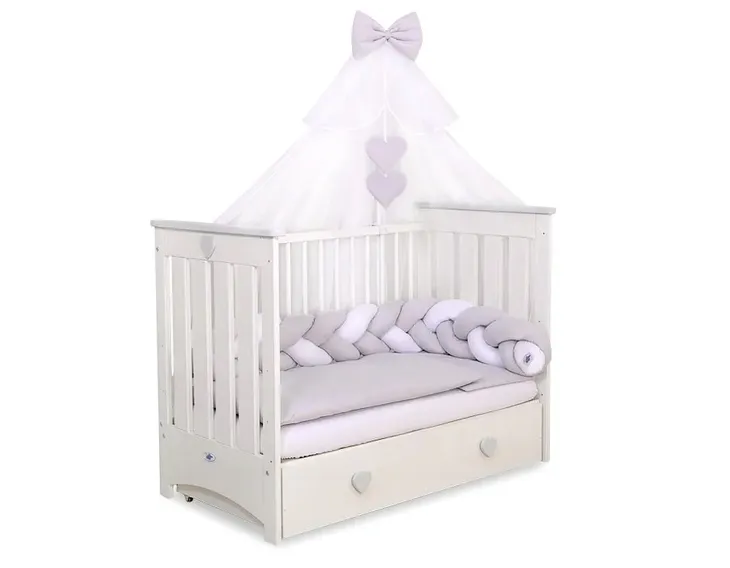 2. Wiszące dwa serduszka + duża gruba kokarda - Dwa wiszące serduszka z miękkim wypełnieniem to słodkie i niepowtarzalne uzupełnienie kompletu pościeli.Przyciągają uwagę dziecka w pierwszych miesiącach życia skutecznie zastępując karuzelkę. Duża gruba kokarda stanowi piękne zwieńczenie całości.