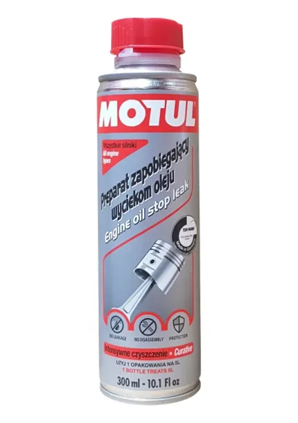 Motul Engnie Oil Stop Leak zapobiega utracie oleju silnikowego spowodowanej niewielkimi wyciekami. Zapewnia elastyczność uszczelek i o-ringów silnika oraz zapobiega wyciekom oleju przez wszelkie uszczelnienia elastomerowe. Kompatybilny ze wszystkimi mineralnymi i syntetycznymi olejami silnikowymi. Sposób użycia: wlać całą butelkę do oleju silnikowego. Jedna butelka ( 300ml ) wystarczy na 5 litrów oleju silnikowego. W przypadku większych objętości dodaj 50ml Motul Engine Oil Stop Leak na litr oleju silnikowego. Działa podczas pracy silnika.