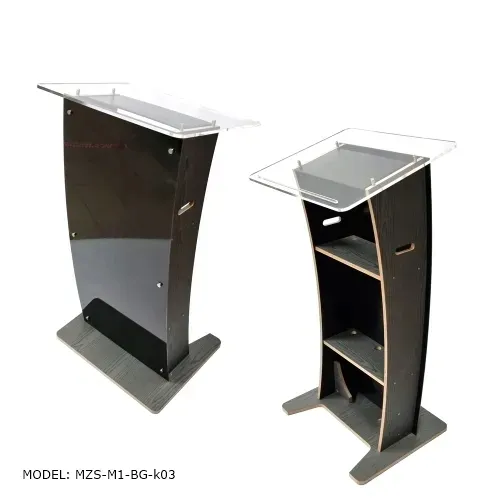 Przykłady mównic z zainstalowanymi mikrofonami i z lampką oświetlającą pulpit.