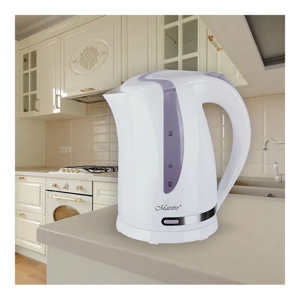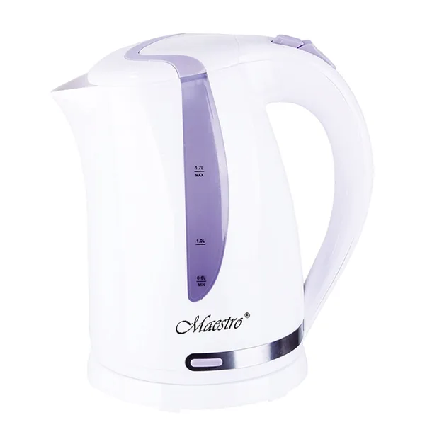 Czajnik elektryczny Maestro o pojemności 1,7 litra to praktyczne wyposażenie każdej kuchni. Moc 2000 W pozwala błyskawicznie zagotować wodę na kawę, herbatę lub zupę instant, dzięki czemu oszczędzasz czas każdego dnia. Klasyczna, biało-fioletowa obudowa z tworzywa sztucznego sprawia, że urządzenie świetnie komponuje się z każdą aranżacją kuchni.