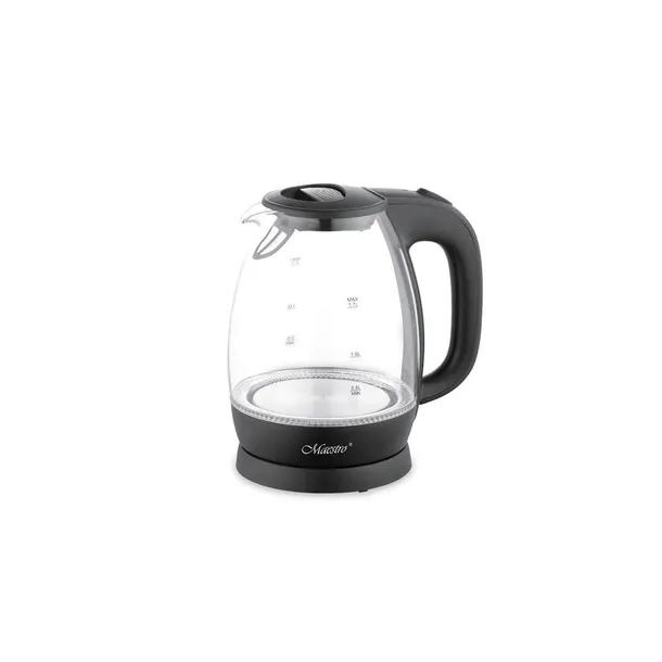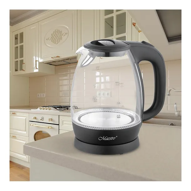 Elektryczny czajnik Maestro w stylu szklanym o pojemności 1,7 l i mocy 2200 W to doskonałe rozwiązanie dla miłośników herbaty i kawy. Obudowa z połączenia szkła i trwałego tworzywa sztucznego zapewnia nie tylko elegancki wygląd, ale również wytrzymałość na długotrwałe użytkowanie. Wyposażony w wymienny filtr antywapienny oraz funkcję obrotowej podstawy 360°, zapewniające wygodę i łatwość użytkowania. Długość przewodu zasilającego wynosząca 70 cm daje swobodę w ustawieniu czajnika na każdej kuchennej powierzchni. Czajnik Maestro zapewnia nie tylko szybkie zagotowanie wody, ale również komfort użytkowania i estetyczny design. Wymiary czajnika to 22 x 19,8 x 15 cm, co czyni go odpowiednim nie tylko do domowej kuchni, ale również biura czy salonu.
