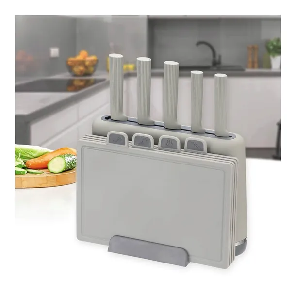 Stylowa podstawka na noże i deski pozwala przechowywać wszystkie elementy zestawu w jednym miejscu. Dzięki temu kuchnia pozostaje uporządkowana, a niezbędne akcesoria są zawsze łatwo dostępne. Nowoczesny szary kolor sprawia, że zestaw doskonale pasuje do współczesnych aranżacji kuchennych.