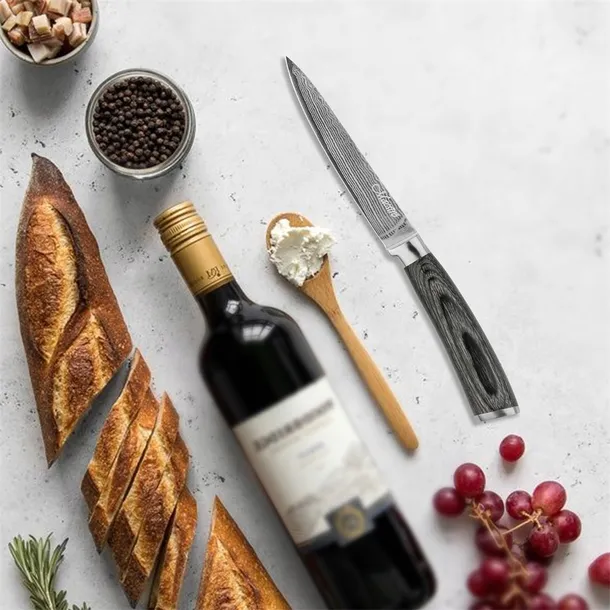 Uniwersalny nóż kuchenny o długości 15cm, wykonany z wyjątkowo trwałej damasceńskiej stali, to połączenie ostrości, elegancji i wygody. Idealny do codziennego krojenia warzyw, owoców, mięsa czy wędlin, zapewnia niezrównaną precyzję i komfort użytkowania.