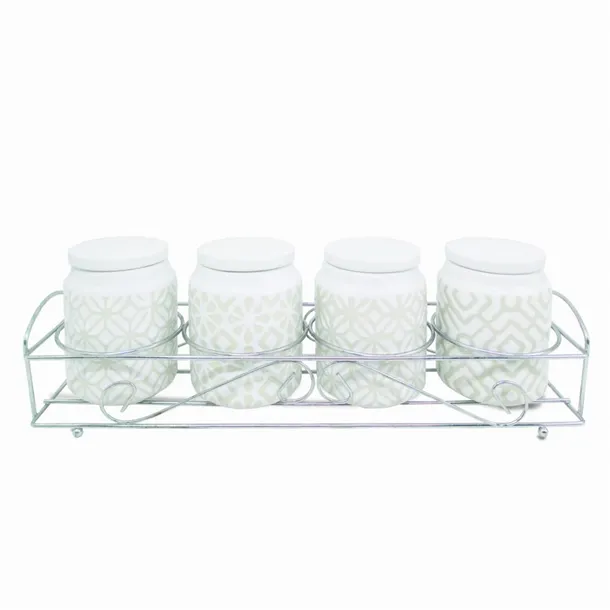 W zestawie znajdują się 4 pojemniki i metalowy stojak.