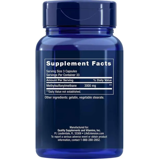 Ingredientes: metilsulfonilmetano, cápsula (gelatina), antiaglomerante (sales magnésicas de ácidos grasos).