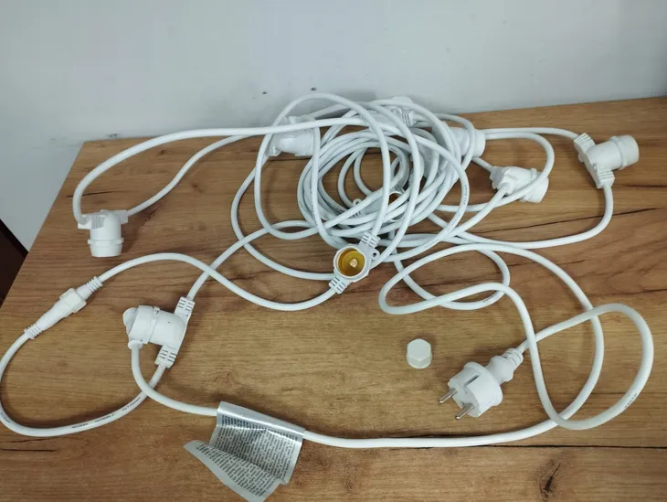 - [Wymiary i funkcje]: Długość łańcucha: 10m, Kolor Czarny, Klasa efektywności energetycznej: A, Liczba uchwytów lampy: 10 (lampy nie są dołączone), E27 IP54, Gniazdo Shuko, Zasilanie: 240V AC, Wodoodporne złącza: IP65.