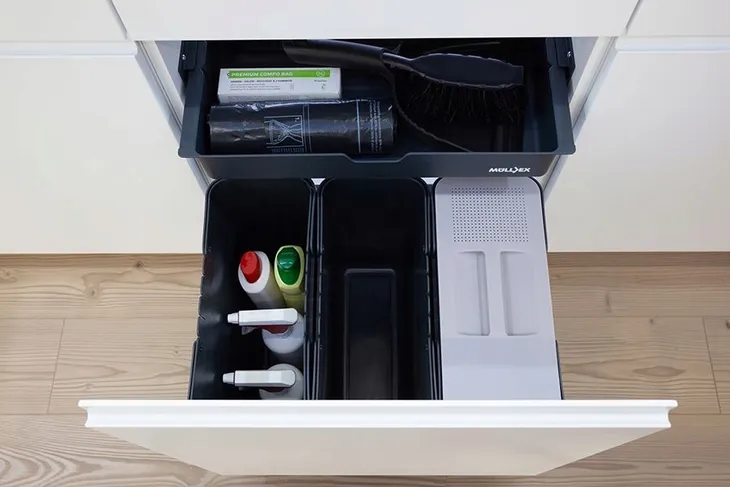 Trzy 16-litrowe pojemniki zapewniają miejsce na szeroką gamę materiałów nadających się do recyklingu. Perforowana pokrywa zapewnia wystarczającą cyrkulację powietrza.