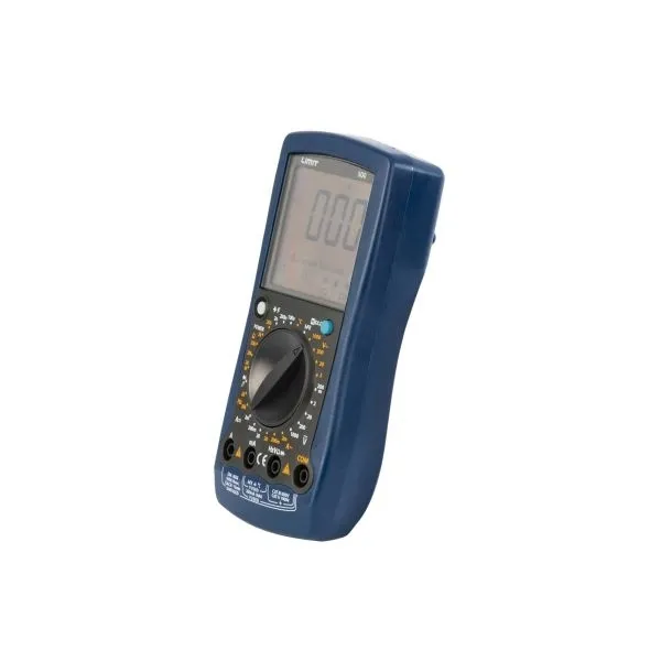 Multimetr cyfrowy o dużym wyświetlaczu, wskazującym poprawność dołączenia kabelków oraz wybrany zakres. Do mierzenia napięcia stałego/zmiennego, prądu stałego/zmiennego, rezystancji, pojemności, częstotliwości, temperatury. Ponadto posiada następujące funkcje: test diodowy, test tranzystorów, test ciągłości obwodu z sygnalizacją akustyczną, pamięć wyniku pomiaru "datahold", sygnalizacja niskiego stanu baterii. Automatyczne wyłączanie.Dostarczany w komplecie z kabelkami pomiarowymi, złączem uniwersalnym, przetwornikiem temperatury typu K do maks. 260°C, baterią i instrukcją obsługi. Osłona gumowa i odkładana podpórka.Długość podziałki 1999. Izolacja CAT II 1000V / CAT III 600 V wg IEC 61010. Zabezpieczenie zakresów do maks. 200mA.