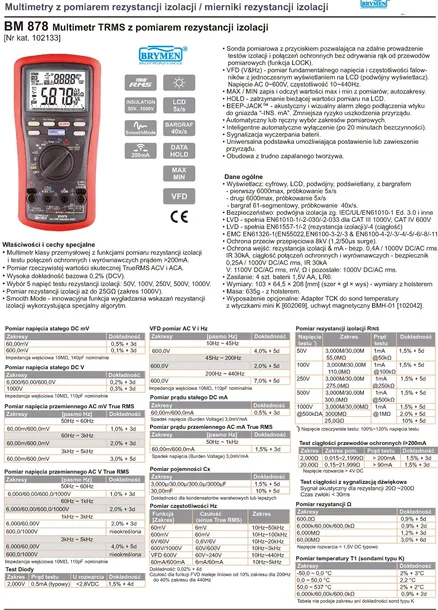 - Wysoki stopień ochrony miernika BM878 to: przeciążenie 1000V, przepięcia 8kV, bezpieczeństwo CAT IV 600V. BM878 ma podwójny podświetlany LCD z próbkowaniem 5x/s i bargraf analogowy.
