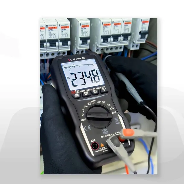 Innowacyjny komfort tego profesjonalnego multimetru jest inny. Wyświetlacz LCD z 7 segmentami po 4 cyfry, 6000 punktów pomiarowych i funkcją analogowego wykresu słupkowego. Oświetlenie LED z tyłu, bardzo wygodne, gdy na blacie jest mało oświetlenia.