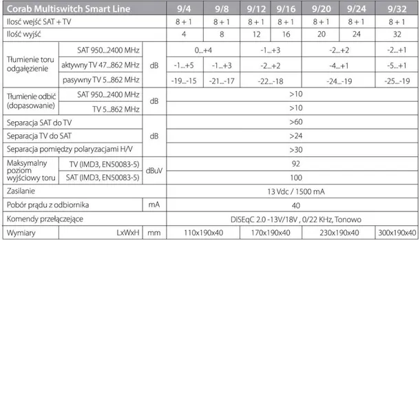 - Separacja pomiędzy wejściami/wyjściami: 30 dB