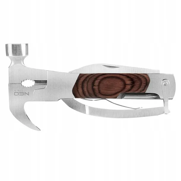 Multitool 13 w 1 NEO (nr ref. 63-113) to wielofunkcyjne narzędzie kryjące w sobie 13 zastosowań: szczypce, szczypce do nakrętek, obcinak przewodów, kleszcze do wyciągania gwoździ, młotek, wkrętak płaski 2x, wkrętak PH, mały nóż, duży nóż, otwieracz do puszek, piła, pilnik. W zestawi znajduje się pouch nylonowy z uchwytem na pasek. Wykonany został ze stali nierdzewnej.