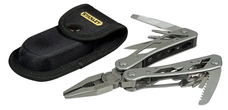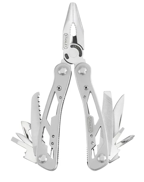 Opis: 12 narzędzi w jednym Kompaktowe narzędzie zawierające 12 podstawowych, zespolonych narzędzi Przydatne szczególnie przy wykonywaniu drobnych prac montażowych, jako dodatkowe wyposażenia w samochodzie, zestaw niezbędnych narzędzi w domu lub na wycieczkach turystycznych Wykonany ze stali nierdzewnej z dołączonym etui Zawiera: uniwersalne szczypce z ząbkowanymi i zaokrąglonymi szczękami oraz szczękami do przecinania drutu, brzeszczot, nóż mały, nóż duży, otwieracz do butelek, wkrętak płaski 3, 4, 8 mm, PH1, pilnik