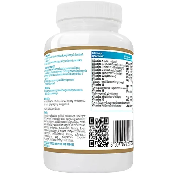 Substancja wypełniająca – sorbitol, substancja słodząca: ksylitol, regulator kwasowości – kwas cytrynowy, witaminy ( kwas L-askorbinowy, amid kwasu nikotynowego, octan DL-alfa-tokoferylu, D-pantotenian wapnia, ryboflawina, chlorowodorek pirydoksyny, monoazotan tiaminy, kwas pteroilomonoglutaminowy, D-biotyna, metylokobalamina, octan retinylu, cholekalcyferol), aromat, substancja przeciwzbrylająca: sole magnezowe kwasów tłuszczowych, substancja słodząca: sukraloza.