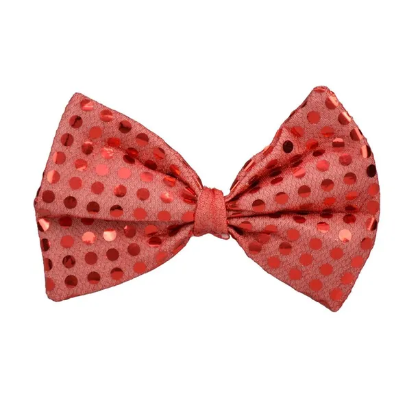 Błyszcząca muszka w kolorze czerwonym. Mucha zdobiona jest połyskującymi kropeczkami. Mocowanie za pomocą elastycznej gumeczki zapewnia wygodne noszenie oraz zakładanie. Zabawny element stylizacji na zabawę karnawałową, imprezę tematyczną, przyjęcie w stylu disco. Muszka o wymiarze 14x9 cm.