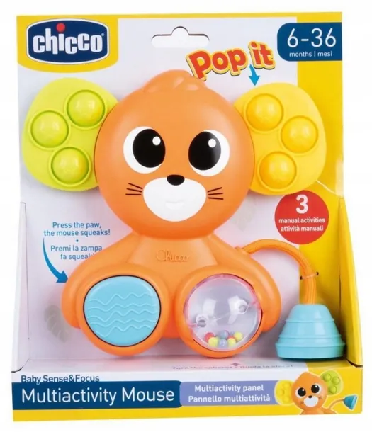 MYSZKA 'POP IT' - wielofunkcyjna zabawka z postacią myszki, pełna aktywności, aby stymulować zdolności motoryczne i koordynację rąk dziecka.- Miękkie plastikowe uszy z zabawką do wciskania (pop-it), aby stymulować koncentrację i relaks dziecka. Ta prosta zabawa pozwala dzieciom się skoncentrować, ale także rozładować stres.- Piszczałka i obrotowa kula wypełniona kolorowymi kuleczkami.- Ogon z sznurka - łatwy do chwytania.- 3 różne materiały: miękki plastik, twardy plastik i sznurek, aby stymulować wrażliwość dotykową.Kategoria wiekowa: 6-36MWymiary zabawki: 19 x 18 x 5,5 cmWymiary opakowania: 21 x 25 x 6,5 cm