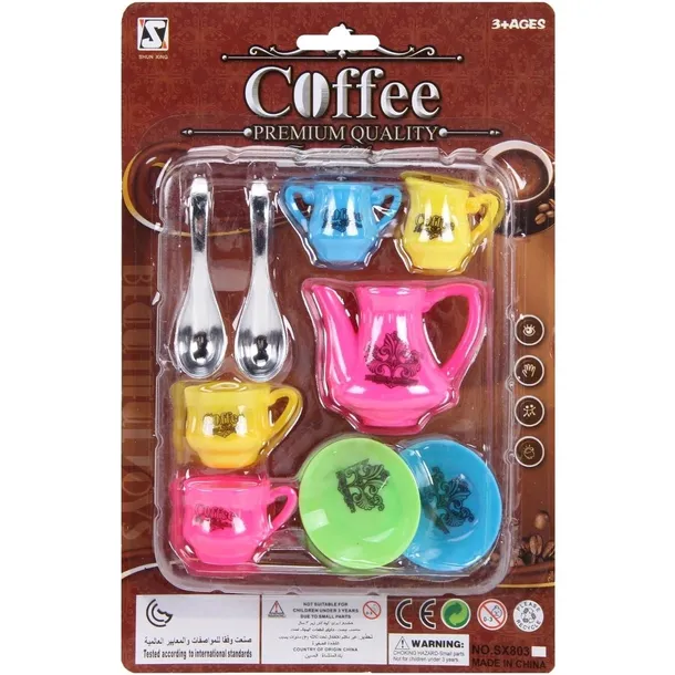 Zestaw Do Kawy/Herbaty "PREMIUM QUALITY" - Kolorowa Zabawa w KawiarnięZapraszamy na popołudniową herbatkę! Ten uroczy, wieloelementowy zestaw do kawy lub herbaty pozwoli Twojemu dziecku na stworzenie własnej kawiarni w domu. Idealny do zabawy w odgrywanie ról i naśladowanie dorosłych.Główne Cechy Zestawu:Bogaty Komplet Elementów: Zestaw zawiera wszystko, co niezbędne do serwowania kawy lub herbaty dla dwojga:o 1 Duży Dzbanek/Czajniczek (w intensywnym kolorze różowym).o 2 Filiżanki (różne kolory, np. żółty i różowy).o 2 Spodki/Talerzyki (różne kolory, np. niebieski i zielony).o 2 Łyżeczki (w kolorze srebrnym/chromowanym).o 1 Dodatkowy Kubek/Filiżanka (np. niebieski).Żywe, Przyciągające Kolory: Elementy są wesołe i jaskrawe (róż, żółty, niebieski, zielony), co stymuluje wzrok dziecka i zachęca do zabawy.Eleganckie Detale: Dzbanek, filiżanki i talerzyki ozdobione są dekoracyjnym, wytłoczonym wzorem, dodającym zestawowi charakteru "Premium Quality".Wspiera Rozwój Społeczny: Zabawa w serwowanie i przyjmowanie gości uczy manier, zasad współżycia społecznego oraz rozwija wyobraźnię i umiejętności komunikacyjne.Specyfikacja Produktu:Nazwa: Zestaw do Kawy/Herbaty "Coffee - Premium Quality"Liczba elementów: 8 sztuk (licząc dzbanek, 3 naczynia do picia, 2 spodki i 2 łyżeczki)Kolorystyka: Wielokolorowa (Różowy, Żółty, Niebieski, Zielony)Wiek Dziecka: 3 lataOstrzeżenie: NIEODPOWIEDNIE DLA DZIECI PONIŻEJ 3 LAT ze względu na małe elementy (ryzyko zadławienia - symbol na opakowaniu).Materiał: Plastik.Wielkość : 16x25x4Idealne na Prezent:Zestaw zapakowany jest w blister, który eksponuje wszystkie elementy, stanowiąc świetny, gotowy upominek. Doskonały jako uzupełnienie dziecięcej kuchni lub stoiska do zabawy.Podaruj swojemu dziecku własny, kolorowy zestaw do serwowania wyśmienitej zabawy!