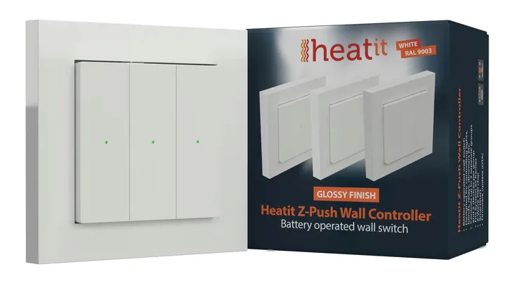 Kontroler naścienny Heatit Z-Push jest dostarczany z wszystkimi trzema klawiszami. Kontroler ścienny Heatit Z-Push jest zasilany przez baterię.Produkt jest przeznaczony głównie do użytku w domach prywatnych. Sterownik ścienny Heatit Z-Push posiada funkcję SmartStart. Funkcja ta pozwala użytkownikowi na włączenie wszystkich urządzeń z funkcją SmartStart poprzez zeskanowanie kodów QR na urządzeniach. Podczas uruchamiania, wszystkie urządzenia są automatycznie włączane do bramki (wymaga kompatybilności ze SmartStart).