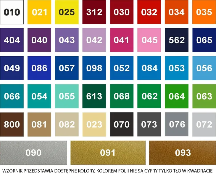 UWAGA! WZORNIK PRZESTAWIA DOSTĘPNE KOLORY, KOLOREM FOLII JEST TŁO KWADRATU