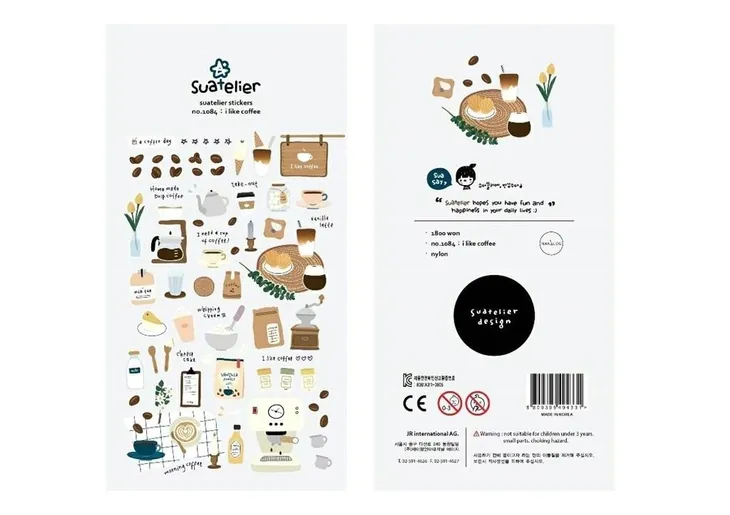 "Naklejki ozdobne Kawa koreańskiej marki Suatelier.Piękne i oryginalne naklejki samoprzylepne, które mogą być używane do ozdabiania notesów, kalendarzy, planerów, telefonów, kartek i wielu innych produktów. Szeroka gama motywów, od prostych i eleganckich do bardziej fantazyjnych i kolorowych pozwala na dopasowanie naklejki do indywidualnego stylu i gustu, nadając osobisty akcent oraz unikalność. Wykonane z wysokiej jakości materiałów oraz drukowane za pomocą nowoczesnych technologii, aby zapewnić trwałość i żywe kolory. Naklejki wykonane z trwałego nylonu. Wymiar arkusza 10x19 cm."