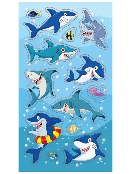 Zestaw naklejek do ozdoby zeszytów, albumów, listów, pocztówek - 8 rekinów z pięknymi ząbkami, 4 małe rybki i 1 malutka meduza.