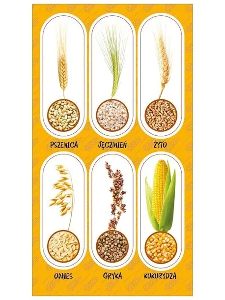 Zestaw naklejek do ozdoby zeszytów, albumów, listów, pocztówek ... 6 naklejek zbóż z kłosami i ziarnami oraz opisami. POLECANE DO SZKÓŁ