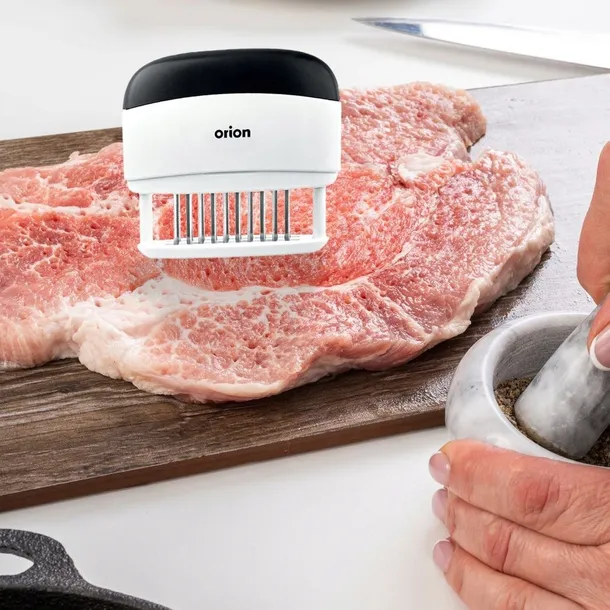 Nakłuwacz do mięsa wyjątkowo przydatny w kuchni. Dzięki niemu nakłujemy kawałki mięsa w bardzo łatwy sposób. Dzięki nakłuciu mięsa łatwiej dotrze do niego marynata a w procesie smażenia pozwoli uzyskać bardziej soczyste mięso. Łatwy w obsłudze i wygodny w użytkowaniu, dzięki odpowiednim kształtom, które zapewnią stabilne leżenie w dłoni. Oryginalny produkt czeskiej marki Orion. Wyprodukowano zgodnie z europejskimi standardami.