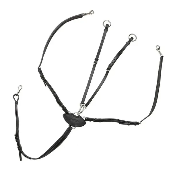 Napierśnik 3-punktowy wykonany z wysokiej jakości skóry, miękko podszyty dla zwiększenia komfortu. Mocowany bezpośrednio do siodła bez paska łączącego na kłębie. Posiada karabińczyki.