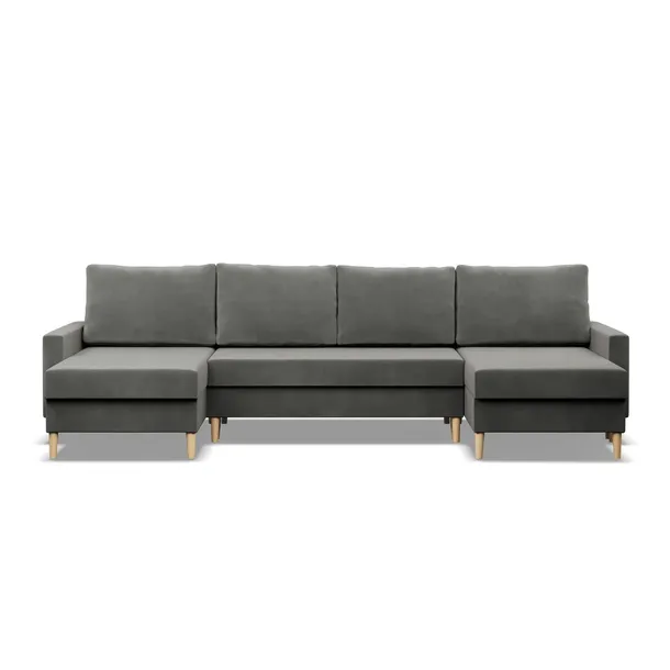 Ma minimalistyczny kształt - proste podłokietniki i wysokie drewniane nóżki, które ułatwiają czyszczenie i codzienną pielęgnację powierzchni mebla. Ten 4-osobowy narożnik do salonu posiada także funkcję spania - możesz go szybko rozłożyć i uzyskać powierzchnię spania aż 140x270 cm!