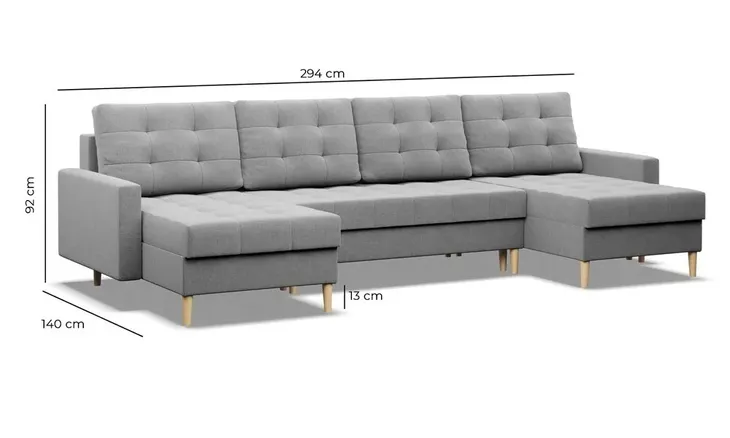 Wymiary: Szerokość: 294 cm Wysokość: 88 cm Głębokość: 140 cm Wysokość siedziska: 38 cm Głębokość siedziska: 123/106-75/58 cm Szerokość siedziska: 70-130-70 cm Powierzchnia spania: 270x140 cm