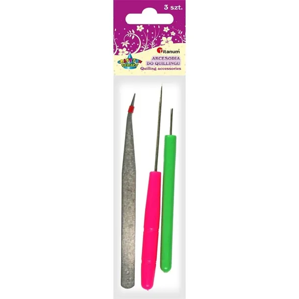 Zestaw narzędzi do pracy w technice quillingu. W zestawie: igła, szpikulec i pęseta precyzyjna.