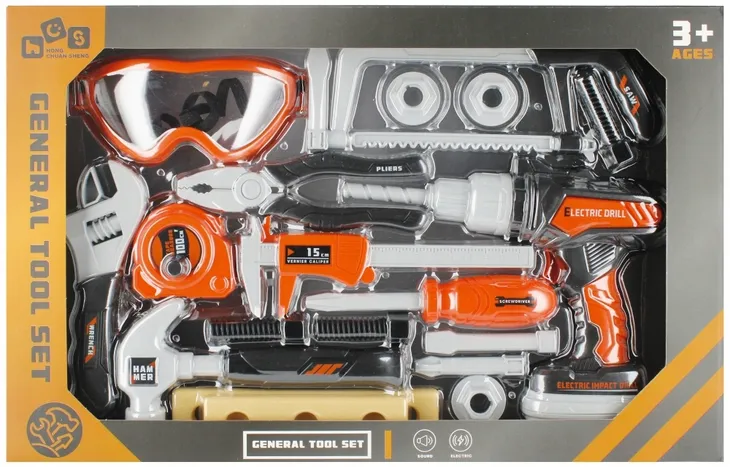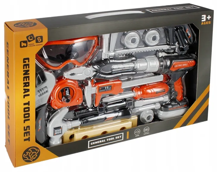 Zalety produktu: Rozwijanie wyobraźni, nauka używania narzędzi warsztatowych, rozwijanie zdolności manualnych, rozwijanie w dziecku pasji. Zestaw Narzędzi MEGA CREATIVE zainteresuje każdego fana majsterkowania. Dzięki tym narzędziom dzieci będą mogły zająć się różnymi konstrukcjami. Może w przyszłości będą naprawdę mistrzami w tym fachu? Zawartość zestawu: wiertarka, okulary ochronne, piła ręczna, kombinerki, miarka, metr, klucz żabka, młotek, śrubokręt 3x nakładki, 3x śrubki 3x nakładka, 1x deseczka mała, 1x deseczka duża . Wiertarka posiada ruchome wiertło, po włączeniu odpowiedniego przycisku wiertło obraca się w prawą bądź w lewą stronę. Wszystkie elementy wykonane z plastiku. Wymiary/waga/baterie: wymiar opakowania dł. x wys. x gł. cm : 42x27x8, waga produktu w opakowaniu kg : 1,64 kg, wymiar produktu d. x wys. x szer. cm -wiertarka 20x16x6, waga produktu kg. 0,92 kg. Wymaga zasilania bateriami-wiertarka 2x AALR06 nie załączonymi do zestawu. Zestaw przeznaczony dla dzieci w wieku: 3 . Pakowany w kartonik z okienkiem. Pakowanie w kartonie po 18/36 szt.
