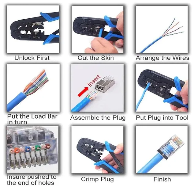 Narzędzie zaciskowe ściągacz do izolacji. Narzędzie zaciskowe ściągacz do izolacji. • Narzędzie wielofunkcyjne – Narzędzie do zaciskania VCE GJ668BL jest szeroko kompatybilne ze złączami 8P8C RJ45 Cat5/Cat5e/Cat6/Cat6a/Cat7 i modułowymi wtyczkami telefonicznymi RJ11 RJ12 6P6C/6P4C. •Wszystko w jednym narzędziu – zawiera wbudowany frez i ściągacz do cięcia kabli Ethernet na żądaną długość i usuwania warstwy zewnętrznej, umożliwiając zakończenie pracy za pomocą tylko jednego narzędzia. RATCHET DESIGN - sprawia, że zaciskanie działa szybciej, łatwiejsze i oszczędza pracę. Ostre odcięte ostrze zapewnia czyste końce przewodów przed włożeniem do wtyczek. Łatwe w użyciu – to narzędzie do zaciskania jest wykonane z wysokiej jakości metalowego materiału, który gwarantuje wytrzymałość i trwałość. Ergonomiczny uchwyt jest łatwy do uchwycenia, zapewniając wygodne działanie kompresji. Marka VCELINK Kolor Niebieski/Czarny Waga 315 Gramy Wymiary elementu dł. x szer. x wys 18,5 x 10,5 x 2,5 cm Typ uchwytu Ergonomiczny Numer modelu ?GJ668BL-1P-DE. Narzędzie zaciskowe ściągacz do izolacji